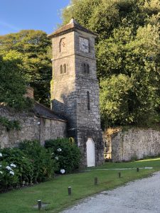 The grand portico at the main entrance gives onto a wide carriage sweep, where visitors’ carriages would have turned before driving back up the main entrance track. Or perhaps the carriages would have been led round the back of the house to the cobbled yard which served the stables and coach house. An unusual feature is the clock tower, believed to be unique on Cornish estates. Strolling through the yard, you can observe the mounting block next to the stables, and notice how openings in the wall were blocked up or inserted over the years.