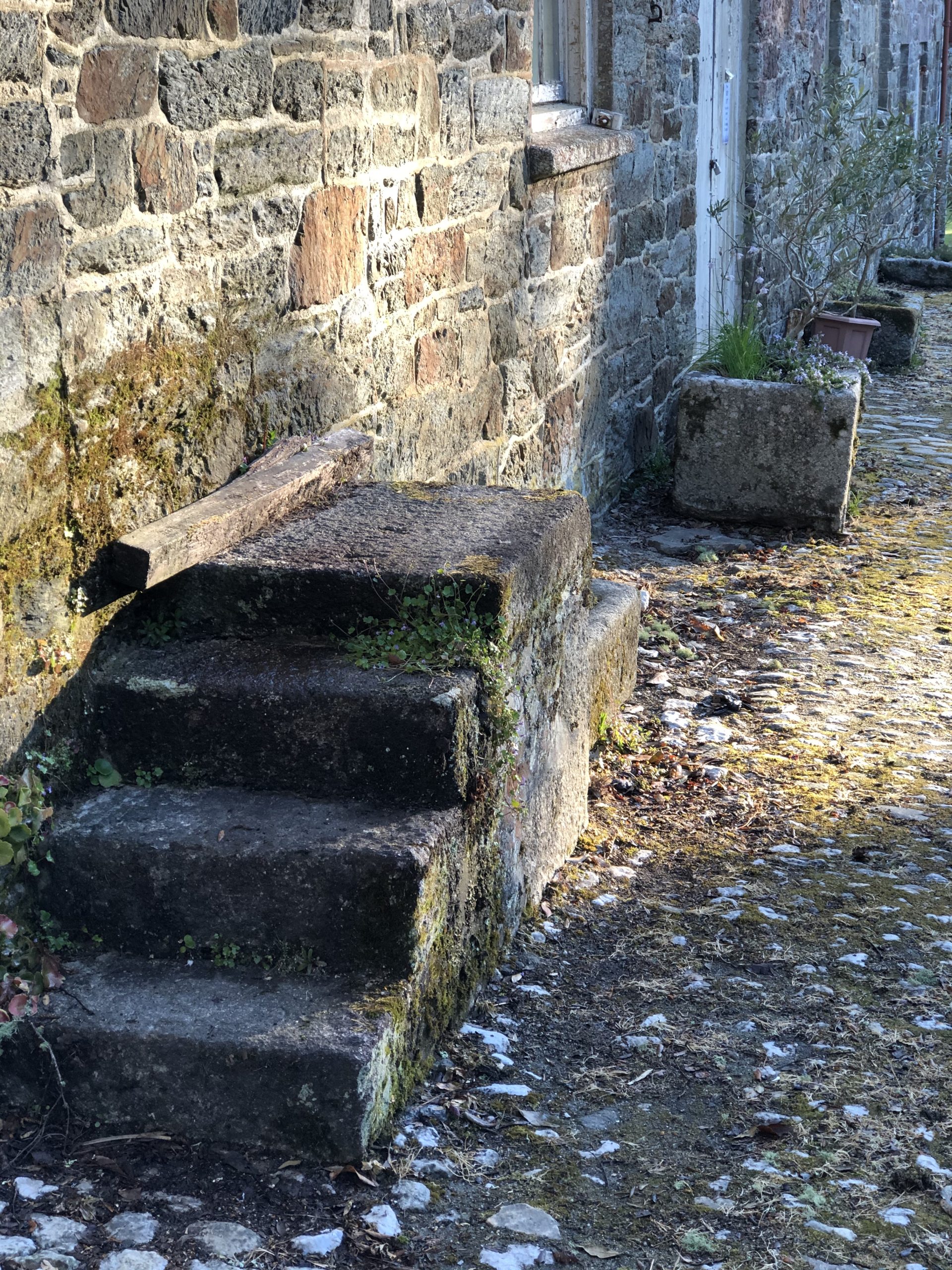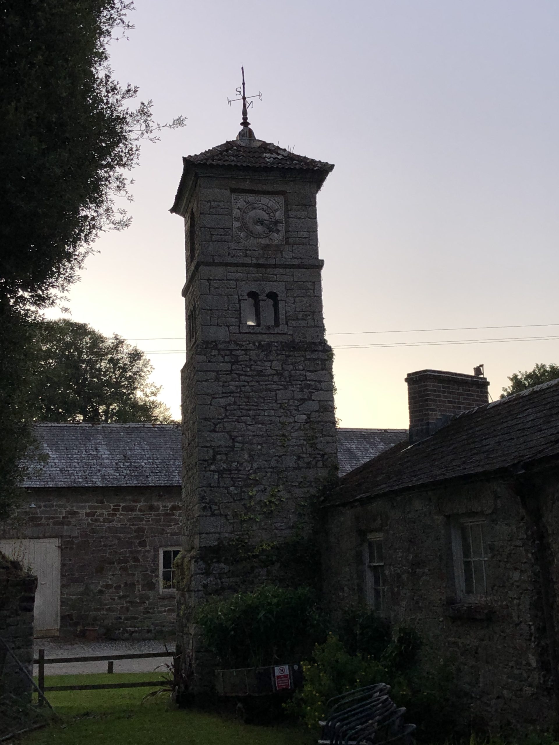 The grand portico at the main entrance gives onto a wide carriage sweep, where visitors’ carriages would have turned before driving back up the main entrance track. Or perhaps the carriages would have been led round the back of the house to the cobbled yard which served the stables and coach house. An unusual feature is the clock tower, believed to be unique on Cornish estates. Strolling through the yard, you can observe the mounting block next to the stables. Notice how openings in the wall were blocked up or inserted over the years.