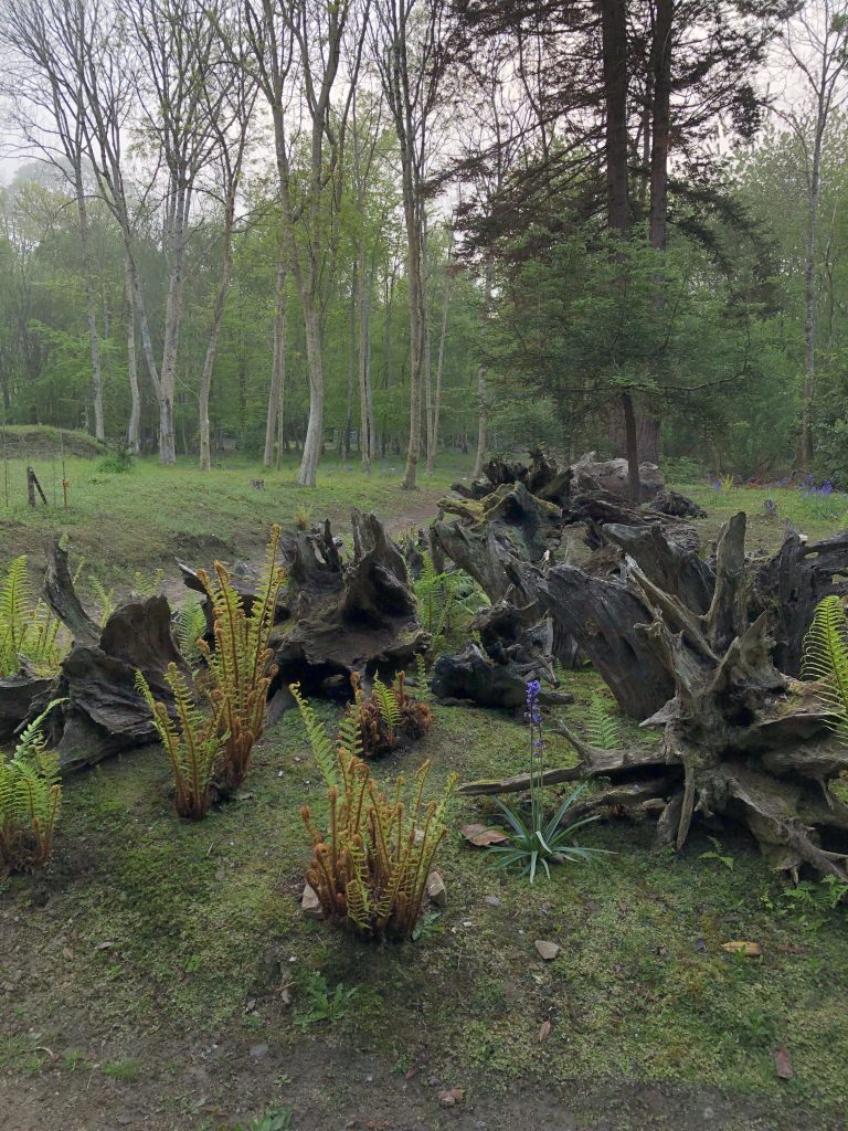 One of the more recent additions to the gardens, the Stumpery is constructed of upturned sweet chestnut roots moved from the surrounding woods and placed together with native British ferns. Moss is now forming over the stumps, making them blend further into their natural habitat.